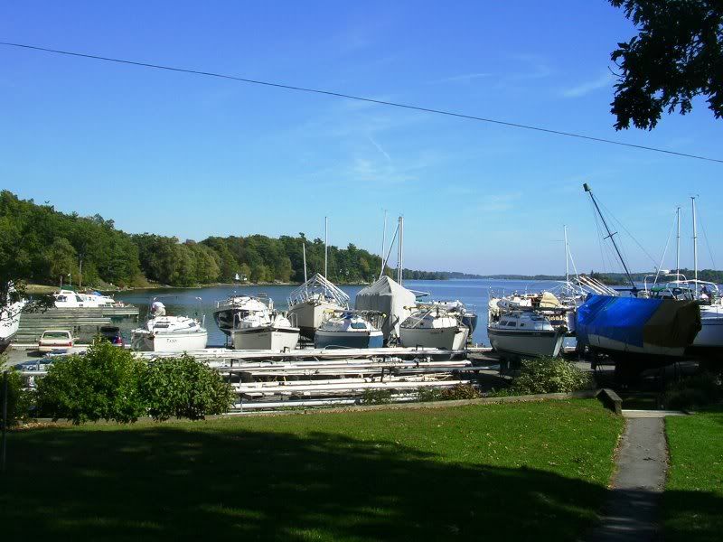 Being brave, we traveled past RMC, into the mouth of the islands and past the Howe Island Ferry. As we were following an antique wooden cabin cruiser, all of a sudden the motor died. GASP! What to do? We thought that the gas at the marina has a bit of water in it as the last 2 times we filled up there, the motor was a bit harder to start. We dumped gas line anti-freeze in it before we left the dock. So that couldn't be it. How ironic it was that our boat stalled in front of a marina. We managed to get the boat started enough to coast into the dock. I felt really ridiculous walking up to a small gathering on the dock to ask them where we were. The Trident Yacht Club, I was told. We called our friend Harly, as we didn't have Rogers cell phone number in the cell phone. Roger just happened to be at Harlys and very kindly offered to come help us. After a few hours of waiting, Roger appeared on the horizon. Now don't get me wrong, it was a beautiful spot and the sun was burning into my skin. We had food and drinks and an offer to use the 'head' in the club house. It wasn't a bad way to while the time away. And the scenery was gorgeous!