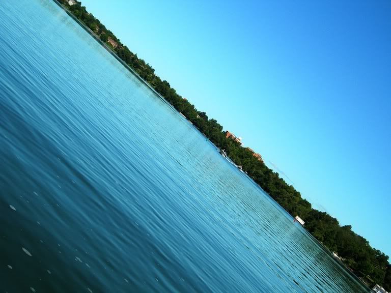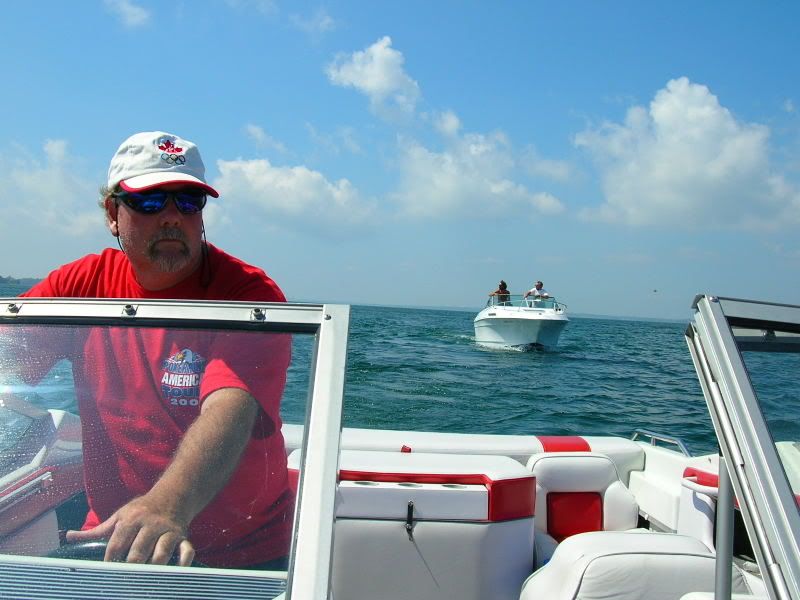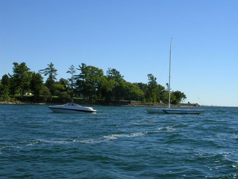 As soon as we left the marina, we swung around the breakwall to this sight...a power boat towing a blow boat. How amusing: