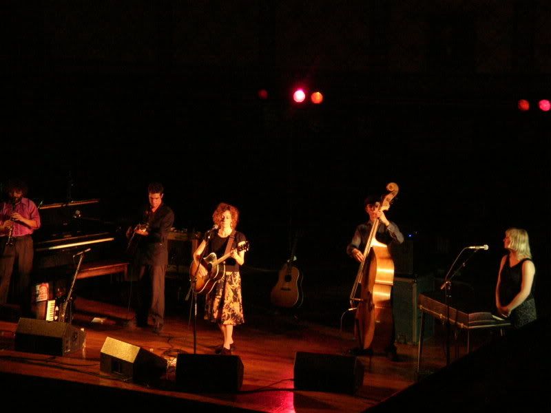 The next night (Sunday) I picked up my friend Christine and off to Grant Hall (Queen's) we went. Sarah Harmer and her band were playing and the depressing downpour of rain was not about to keep us away. After finding a great parking spot in the underground parking lot, we walked up one flight of stairs and Grant Hall was right in front of us! Good thing we didn't bother with umbrella's!! The show was fantastic but the seating was bad. We didn't get there early enough to get a 'good' seat so we got as close to the stage, on the balcony as we could. The seats were very uncomfortable but I didn't care as the music was soothing and relaxing and I was not going to miss out on another Sarah show. Here is a picture of the band as they performed: